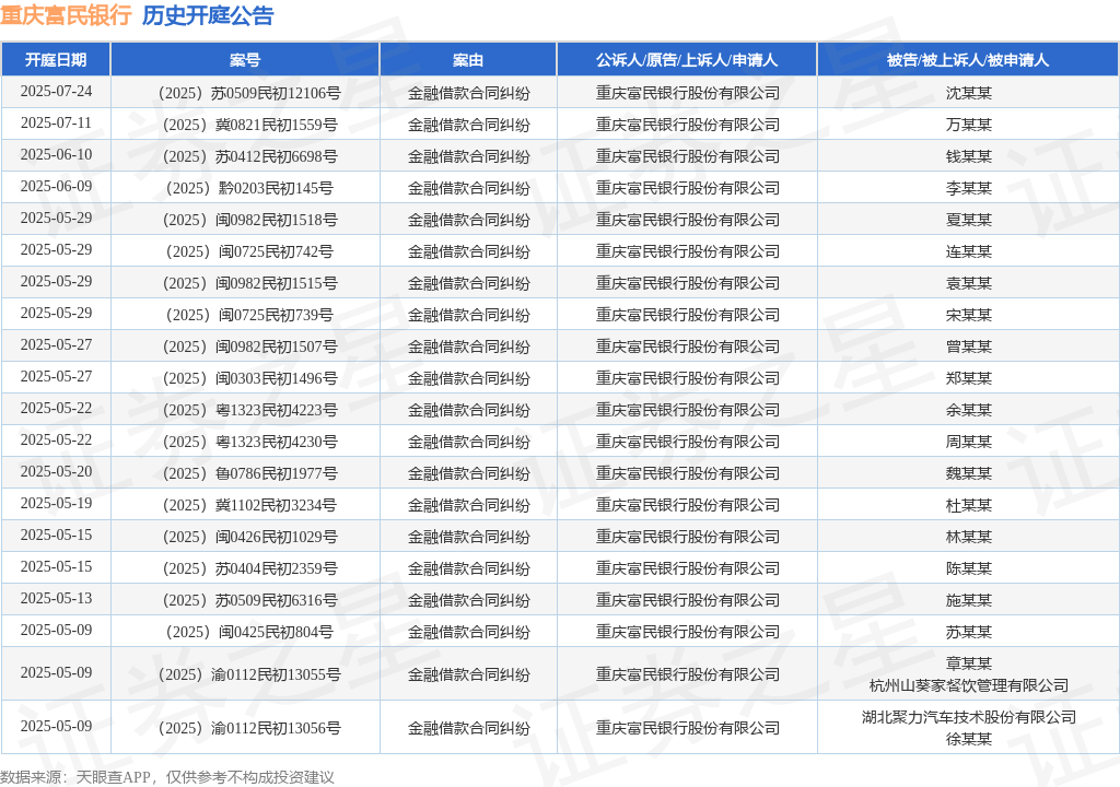 案号:(2025)苏0509民初6316号审理法院:苏州市吴江区人民法院案由:金融借款合同纠纷当事人信息: 原告/上诉人:重庆富民银行股份有限公司 被告/被上诉人:施某某开庭日期:2025年5月13日根据统计,近一年内以重庆富民银行股份有限公司为当事人的历史开庭公告有1001则,其中案由为“金融借款合同纠纷”的公告以747则居首,其次为“借款”有208则,“票据追索权纠纷”有16则。历史开庭公告(前20条)如下: